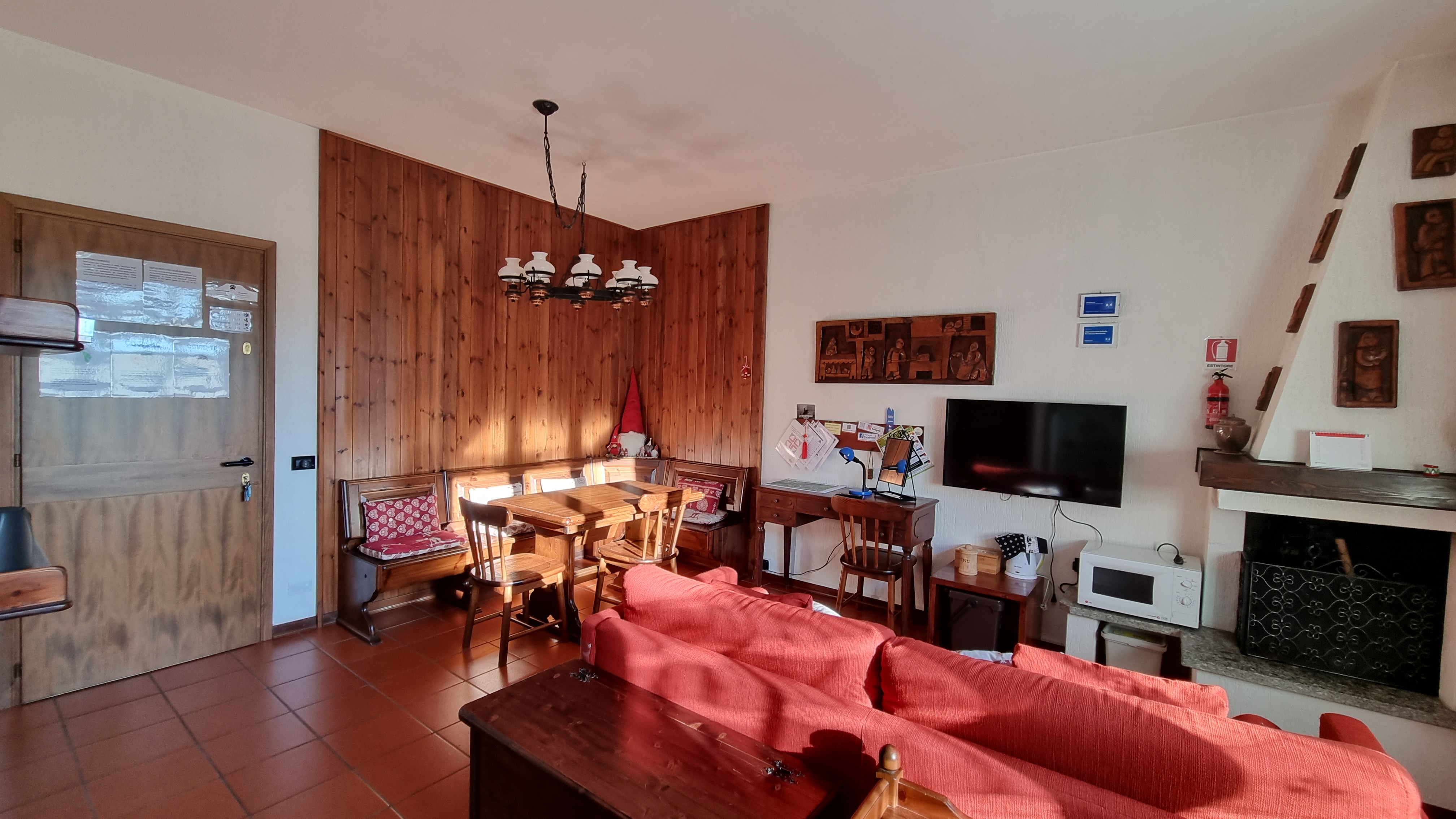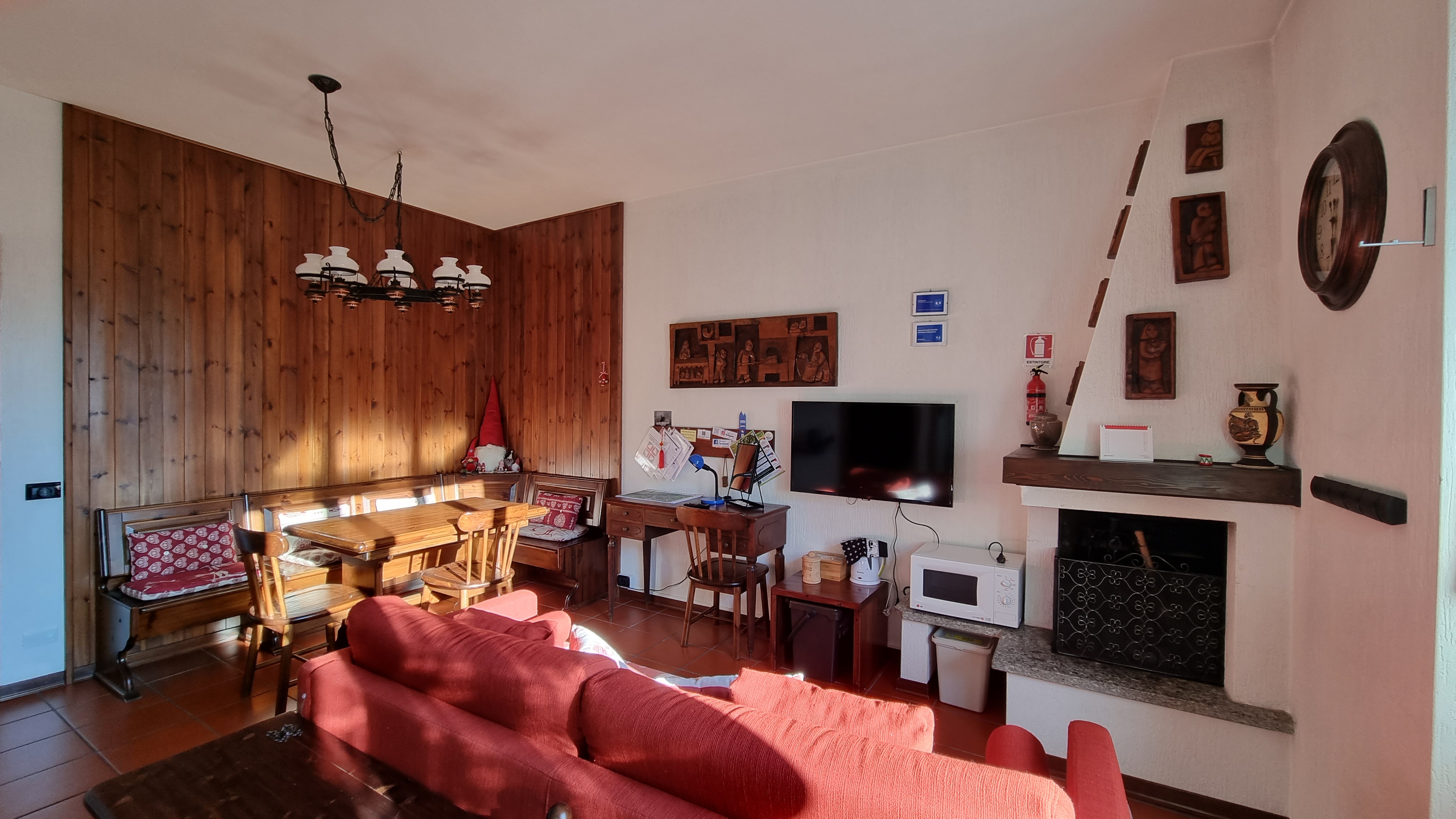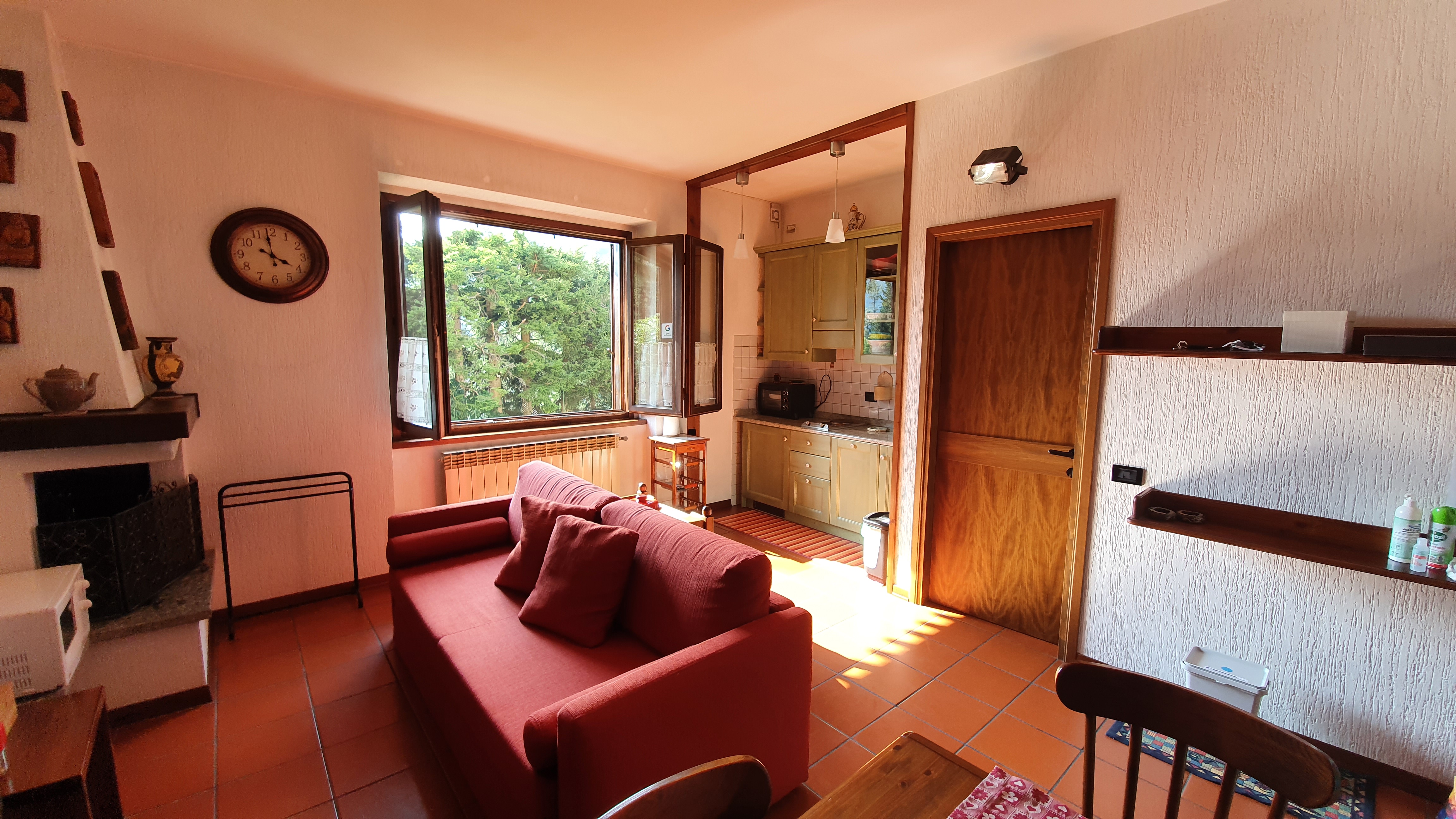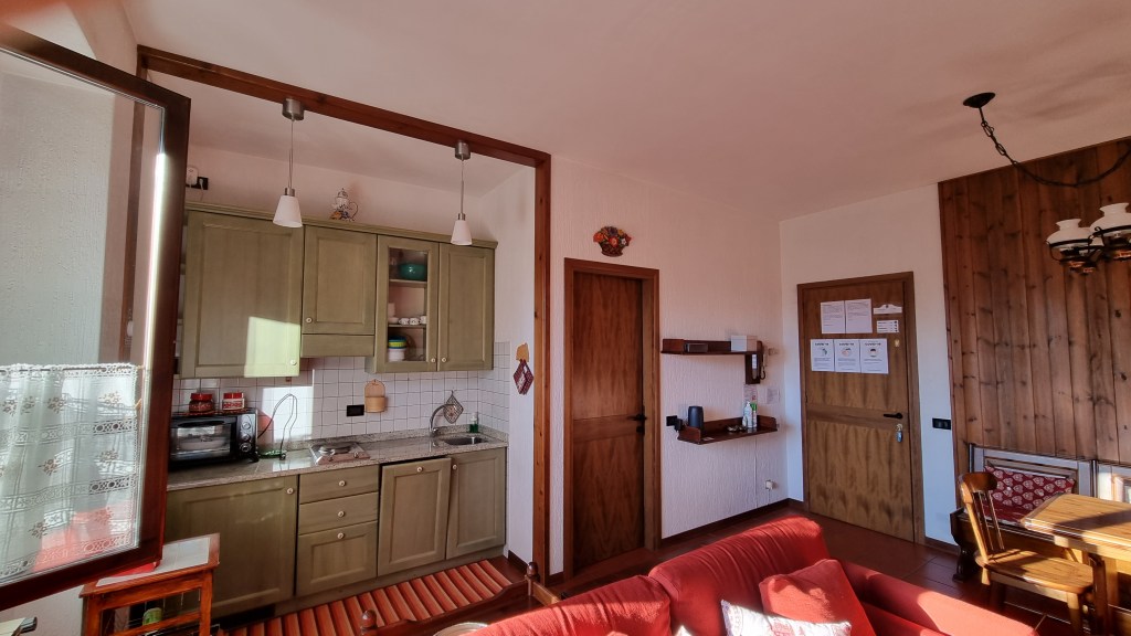 La zona giorno, ampia e molto luminosa, dispone di camino, tavolo da pranzo, televisione a schermo piatto, divano letto che si trasforma in due letti singoli, scrivania con depliant informativi e angolo cottura completo di piastre elettriche, lavastoviglie, fornetto elettrico, forno a microonde, piatti, stoviglie, frigorifero, bollitore.