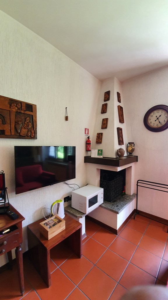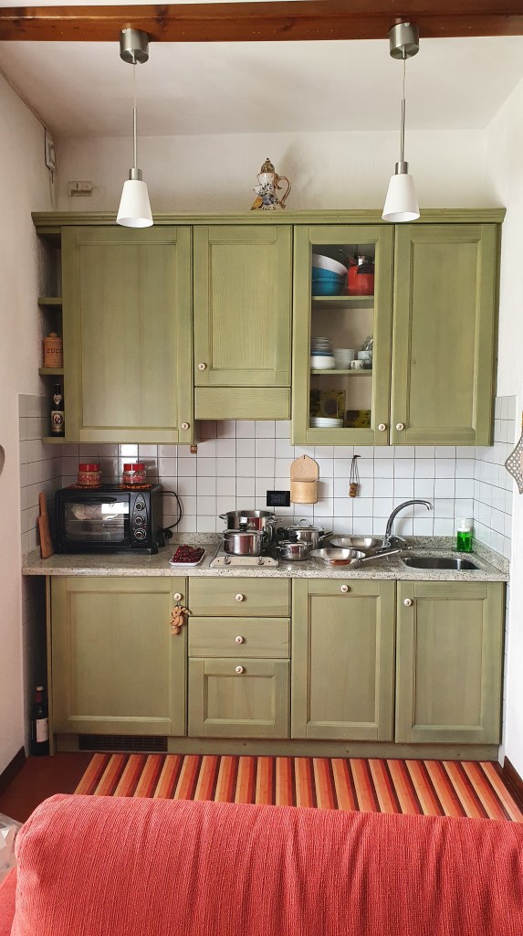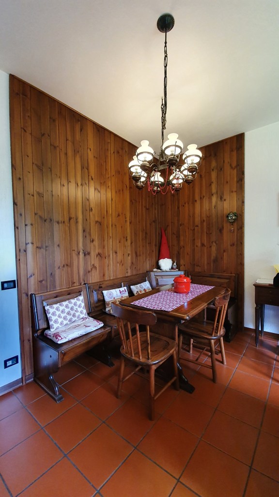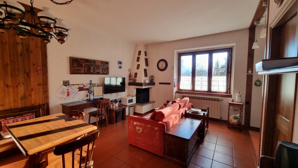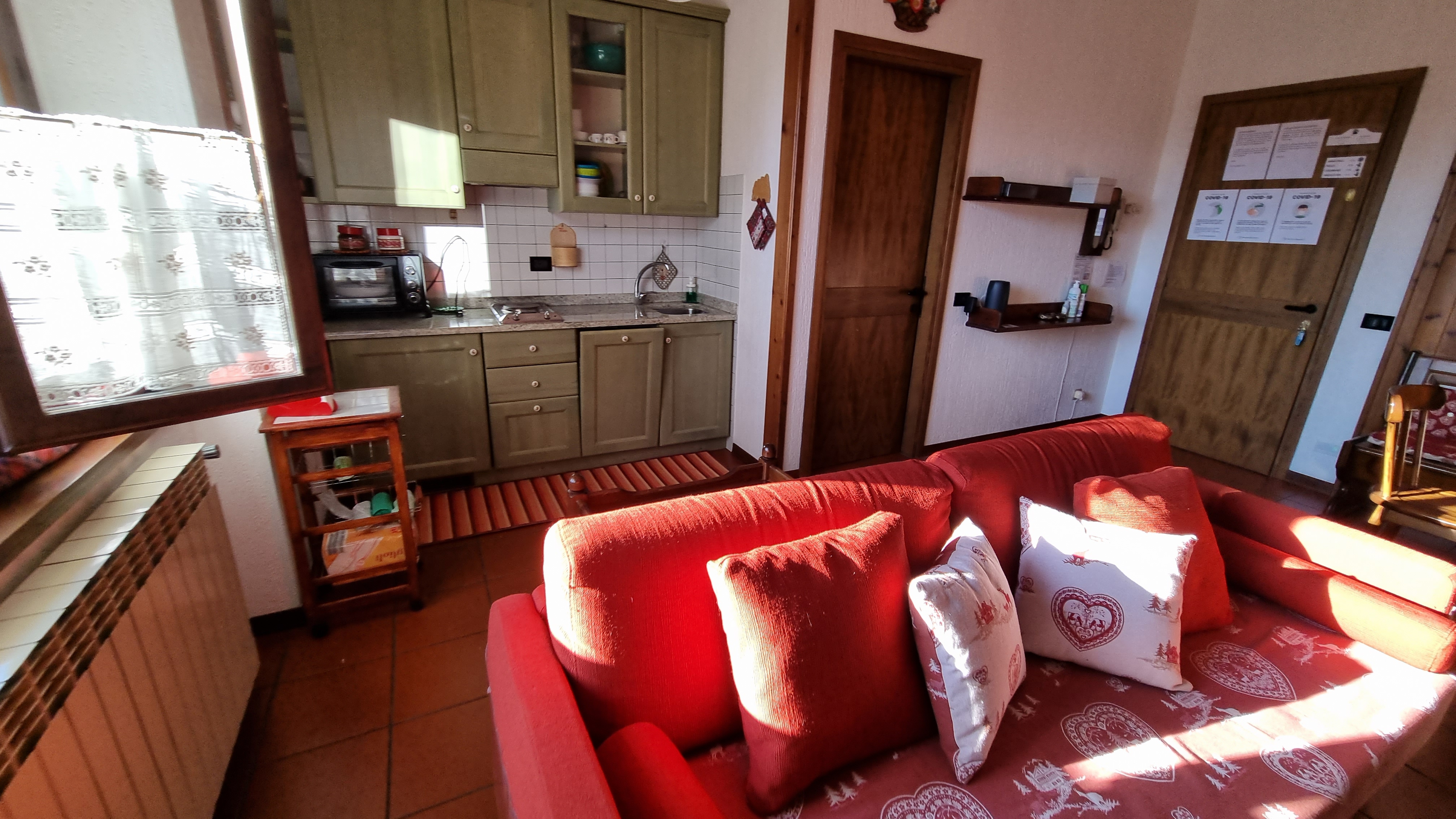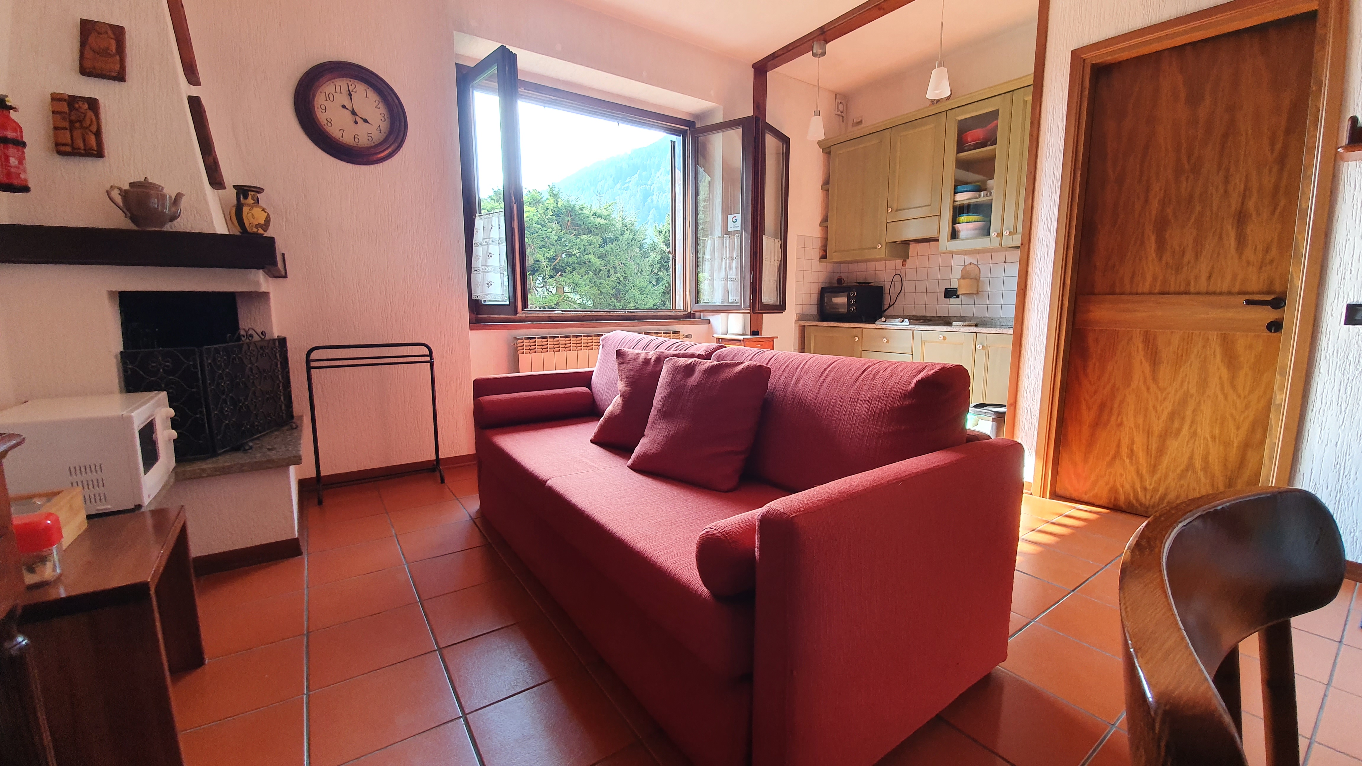 La zona giorno, ampia e molto luminosa, dispone di camino, tavolo da pranzo, televisione a schermo piatto, divano letto che si trasforma in due letti singoli, scrivania con depliant informativi e angolo cottura completo di piastre elettriche, lavastoviglie, fornetto elettrico, forno a microonde, piatti, stoviglie, frigorifero, bollitore.